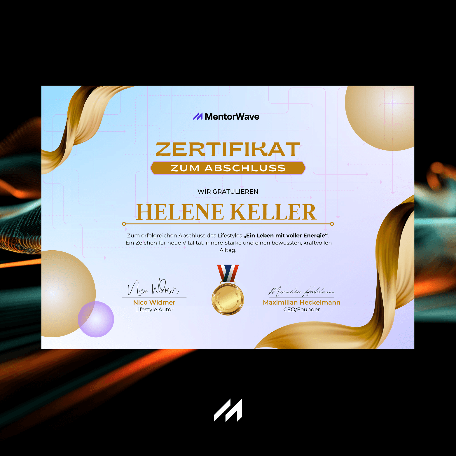 Als Anerkennung für deinen Einsatz und dein Wachstum erhältst du jetzt dein persönliches MentorWave Zertifikat für den Lifestyle "Ein Leben voller Energie". Drucke es aus und behalte es als Erinnerung für deinen Triumpf.